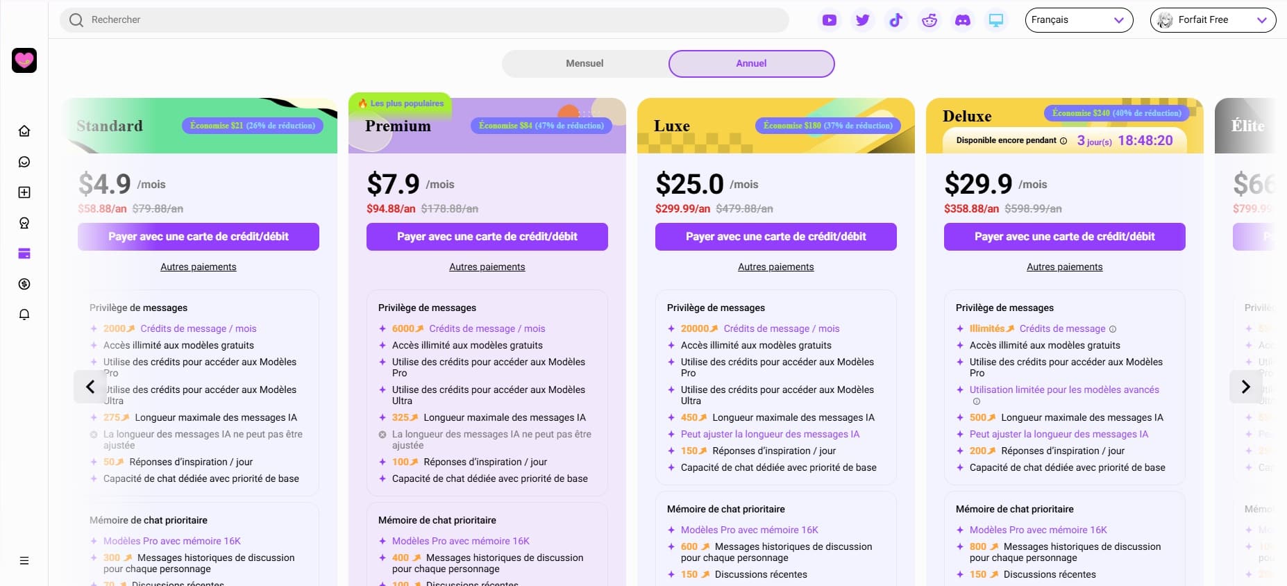 Pour vraiment en profiter, il faut passer à la caisse. Les abonnements commencent à 4,9 $/mois pour 2000 messages et montent jusqu’à 29,9 $/mois pour des messages illimités avec les meilleurs modèles d’IA.