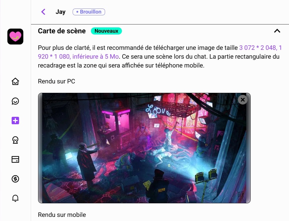 Sur Crushon AI, tu choisis toi-même la photo de ton personnage et il en est de même pour la scène de ton histoire. Contrairement à d’autres chatbots, la plateforme ne permet pas de générer des images.