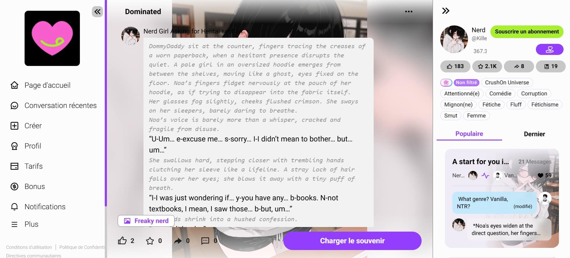 Que ce soit sur le site web ou sur l’application mobile (iOS et Android), l’interface de Crushon AI est une réussite.