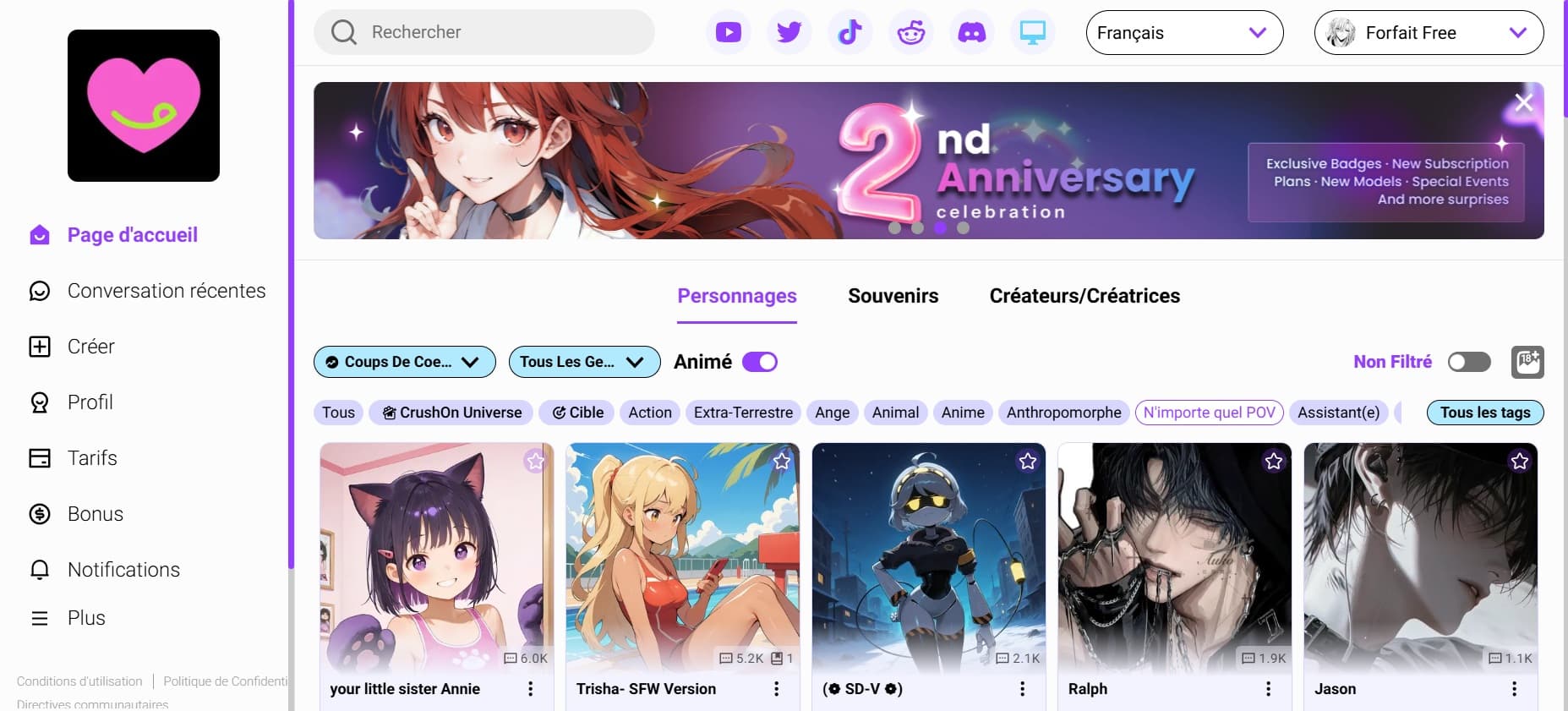 La plateforme elle-même est un écosystème : le partage de personnages est au cœur de l’expérience, assurant un renouvellement constant du contenu. C’est un vrai point fort qui garantit une longue durée de vie à Crushon AI.
