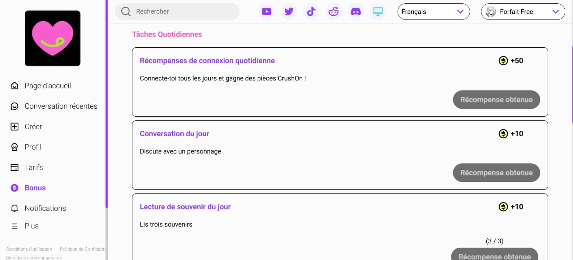 Il existe aussi un système de pièces CrushOn (Crushon Coins) que tu peux gagner via des tâches quotidiennes (comme sur la capture ci-dessous) pour obtenir des messages gratuits.